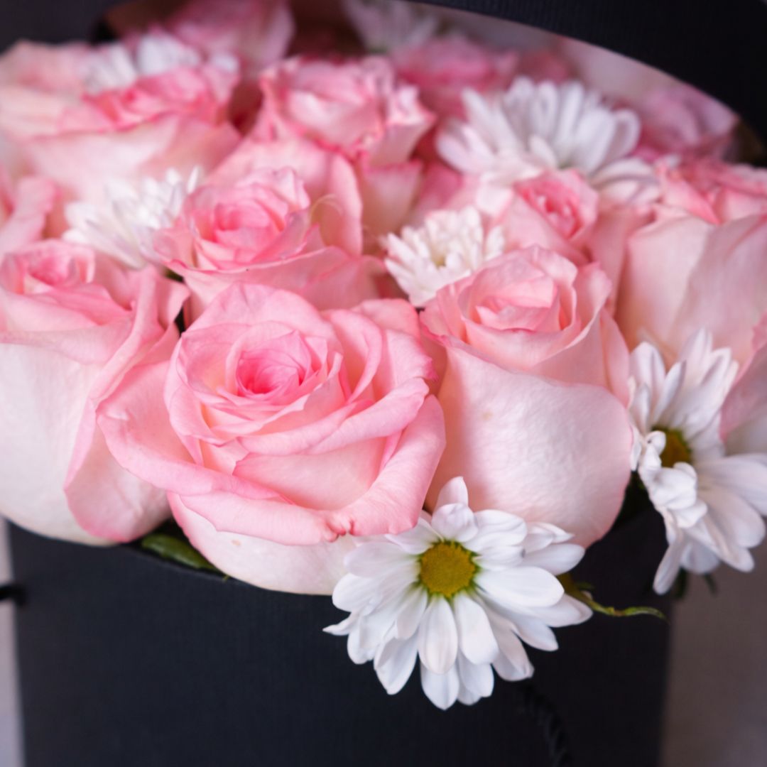 Love Story Box combines soft pink roses with delicate white daisies, creating a romantic, sweet, and elegant composition. Presented in a sleek black box, the pastel tones stand out beautifully, turning this arrangement into an unforgettable gift.