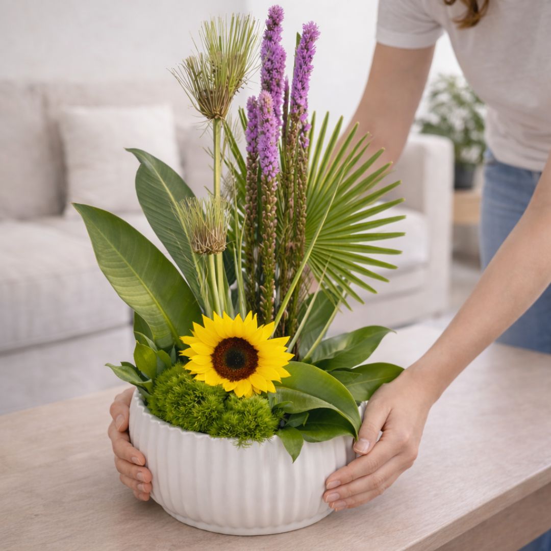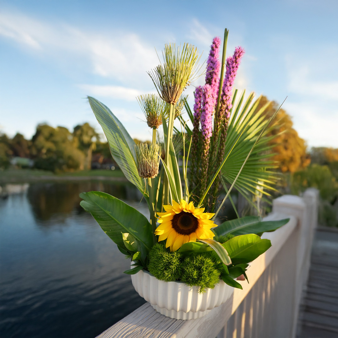 This arrangement features a central sunflower — a symbol of joy and positive energy — complemented by purple liatris, tropical leaves, and natural textures that add height, movement, and visual impact.